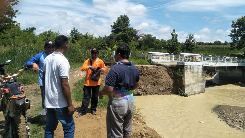 Perangkat Desa Bobol dan Petugas dari Kecamatan Sekar, saat lakukan survey di lokasi longsornya tebing jembatan dan jalan desa di Dusun Kaliklampok Desa Bobol Kecamatan Sekar Bojonegoro. Minggu (16/02/2020)