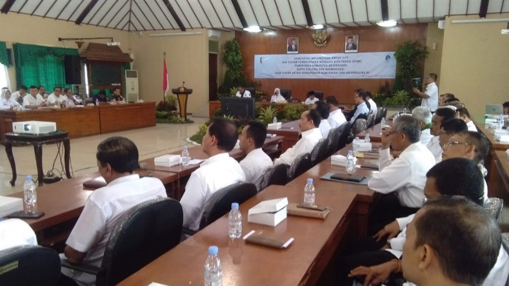 Bojonegoro - Pemerintah Kabupaten (Pemkab) Bojonegoro melalui Dinas Komunikasi dan Informatika (Kominfo), pada Rabu (26/02/2020) bertempat di Gedung Angling Dharma Pemkab Bojonegoro, menggelar Rapat Akselerasi Implementasi Smart City dan Sistem Pemerintahan Berbasis Elektronik, yang dirangkai dengan Evaluasi dan Harmonisasi oleh Direktorat Jenderal (Dirjen) Aplikasi Informatika (Aptika), Kementerian Komunikasi dan Informatika Republik Indonesia.