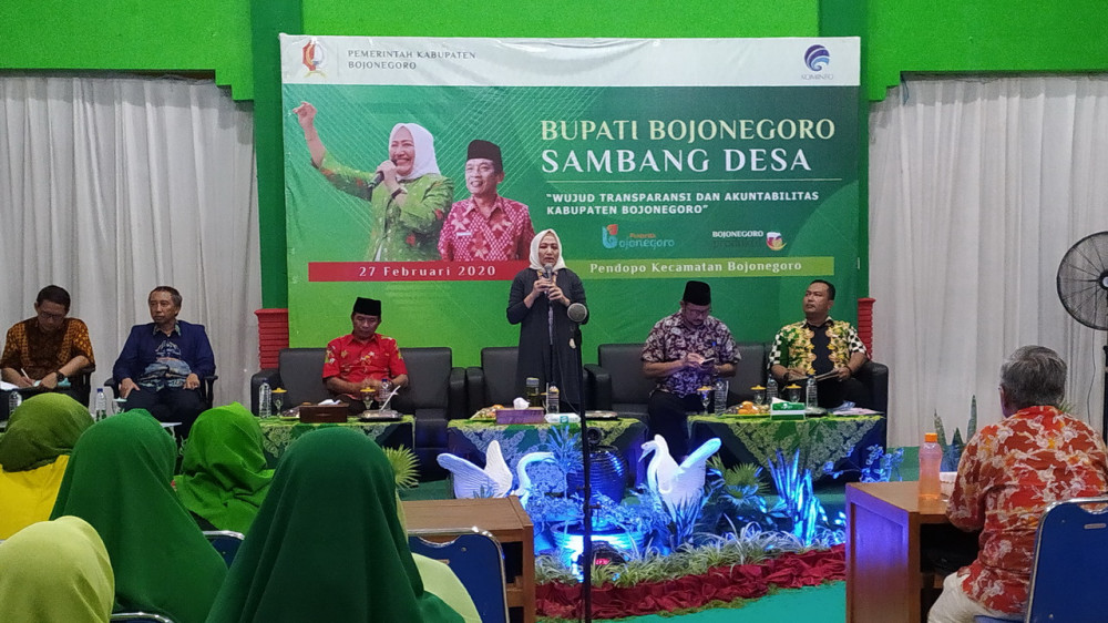 Bupati Bojonegoro, Dr Hj Anna Muawanah saat beri sambutan dalam Sambang Desa yang digelar di Pendapa Kantor Kecamatan Bojonegoro Kota. Kamis (27/02/2020) malam.