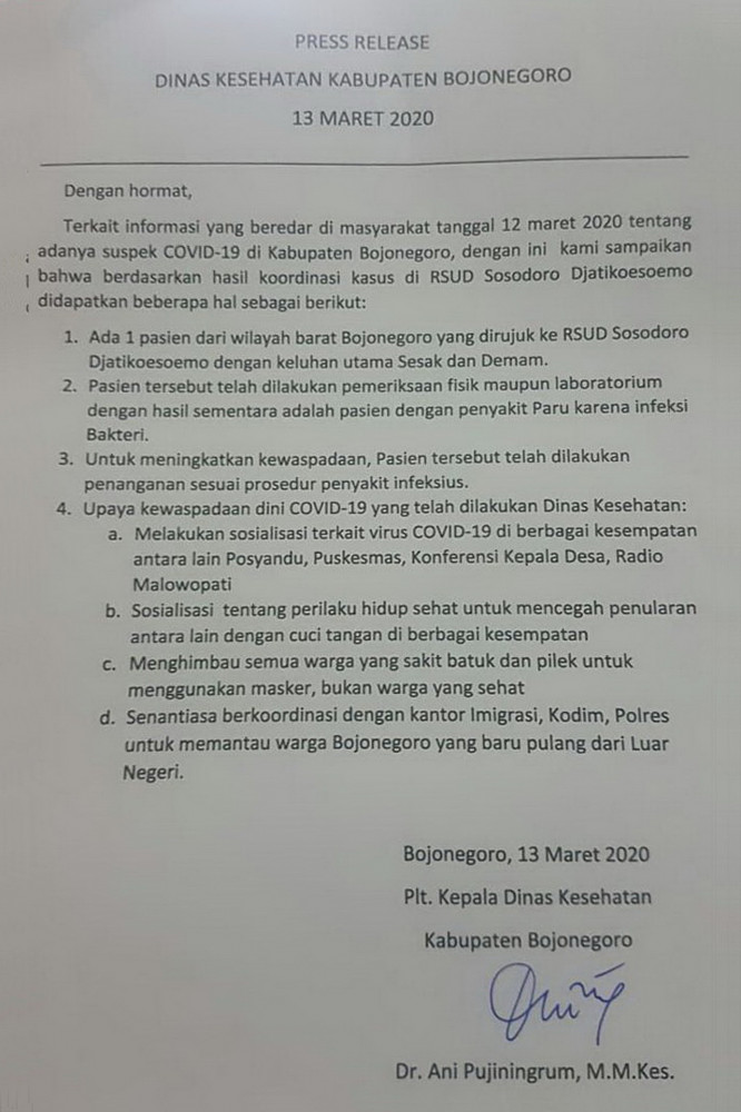 Press Release dari Dinas Kesehatan Kabupaten Bojonegoro tertanggal 13 Maret 2020, yang diterima beritabojonegoro.com