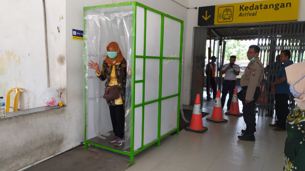 "Jadi protokolnya penumpang yang datang disemprot di dalam bilik disinfektan tersebut," kata Adie Witjaksono.