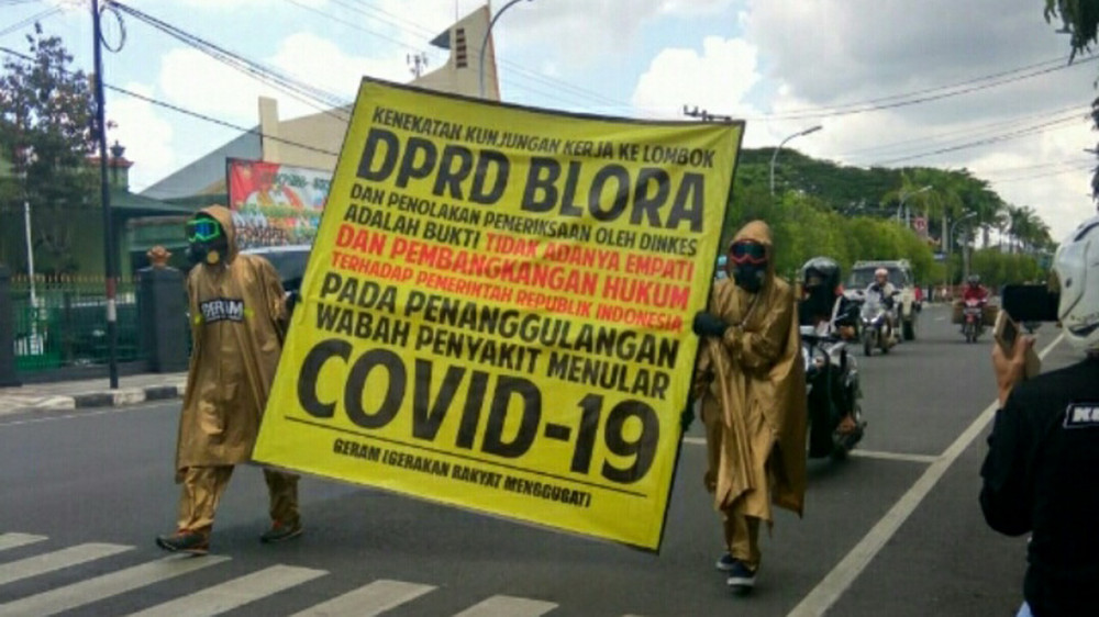 Mereka membentangkan spanduk bertuliskan "Kenekatan kunker DPRD Blora ke Lombok dan penolakan pemeriksaan oleh Dinkes adalah bukti tidak adanya empati dan pembangkangan hukum terhadap pemerintah Republik Indonesia, pada penanggulangan wabah penyakit menular Covid-19."