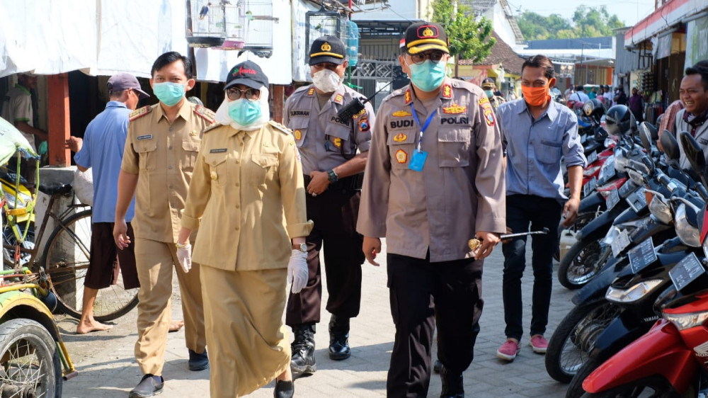 Bojonegoro - Bupati Bojonegoro, Dr Hj Anna Muawanah bersama Kapolres Bojonegoro, AKBP M Budi Hendrawan SIK MH, dengan didampingi Muspika Kapas, pada Senin (30/03/2020) pagi, lakukan inspeksi mendadak (sidak) ke Pasar Tradisional di Kecamatan Kapas.