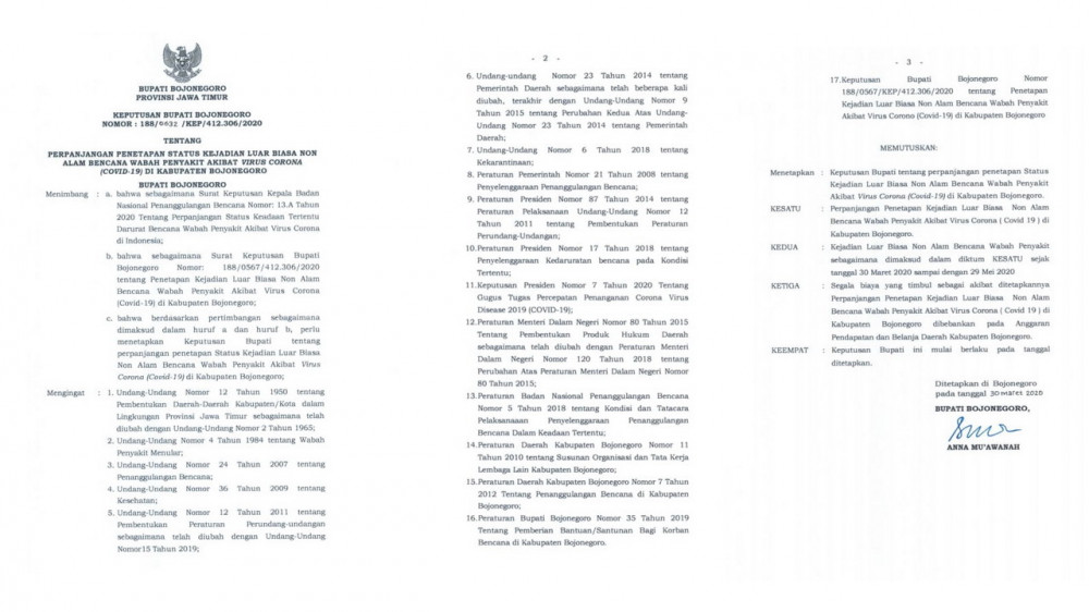 "Bahwa berdasarkan pertimbangan tersebut, perlu menetapkan Keputusan Bupati tentang perpanjangan penetapan Status Kejadian Luar Biasa Non Alam Bencana Wabah Penyakit Akibat Virus Corona (Covid-19) di Kabupaten Bojonegoro," tulis Bupati dalam keputusan tersebut.