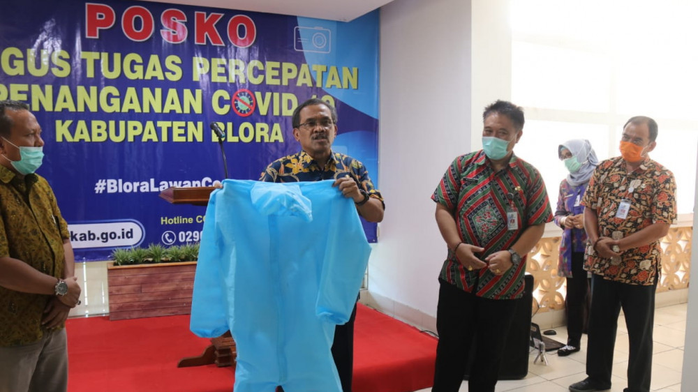 “Pemkab Blora melalui UPTD BLK Diperinaker juga mulai memproduksi APD. Bahannya sudah datang. Besok mulai diproduksi,” ucap Bupati sambil menunjukkan sample APD yang diproduksi.