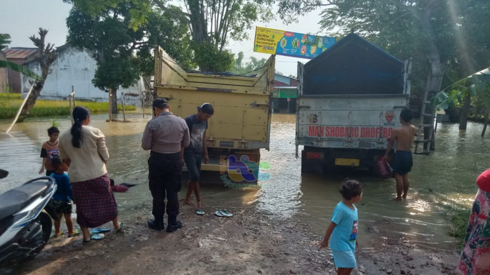 Akibatnya lokasi penampungan sementara dari para pedagang Pasar Sroyo yang ada di Desa Mejuwet Kecamatan Sumberrejo Kabupaten Bojonegoro, terrendam air dengan ketinggian antara 20 hingga 50 sentimeter.