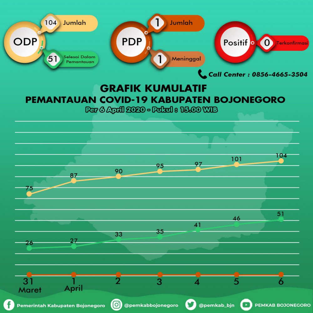 Secara kumulatif, jumlah ODP di Kabupaten Bojonegoro sebanyak 104 orang dan 51 orang dinyatakan selesai dalam pemantauan.