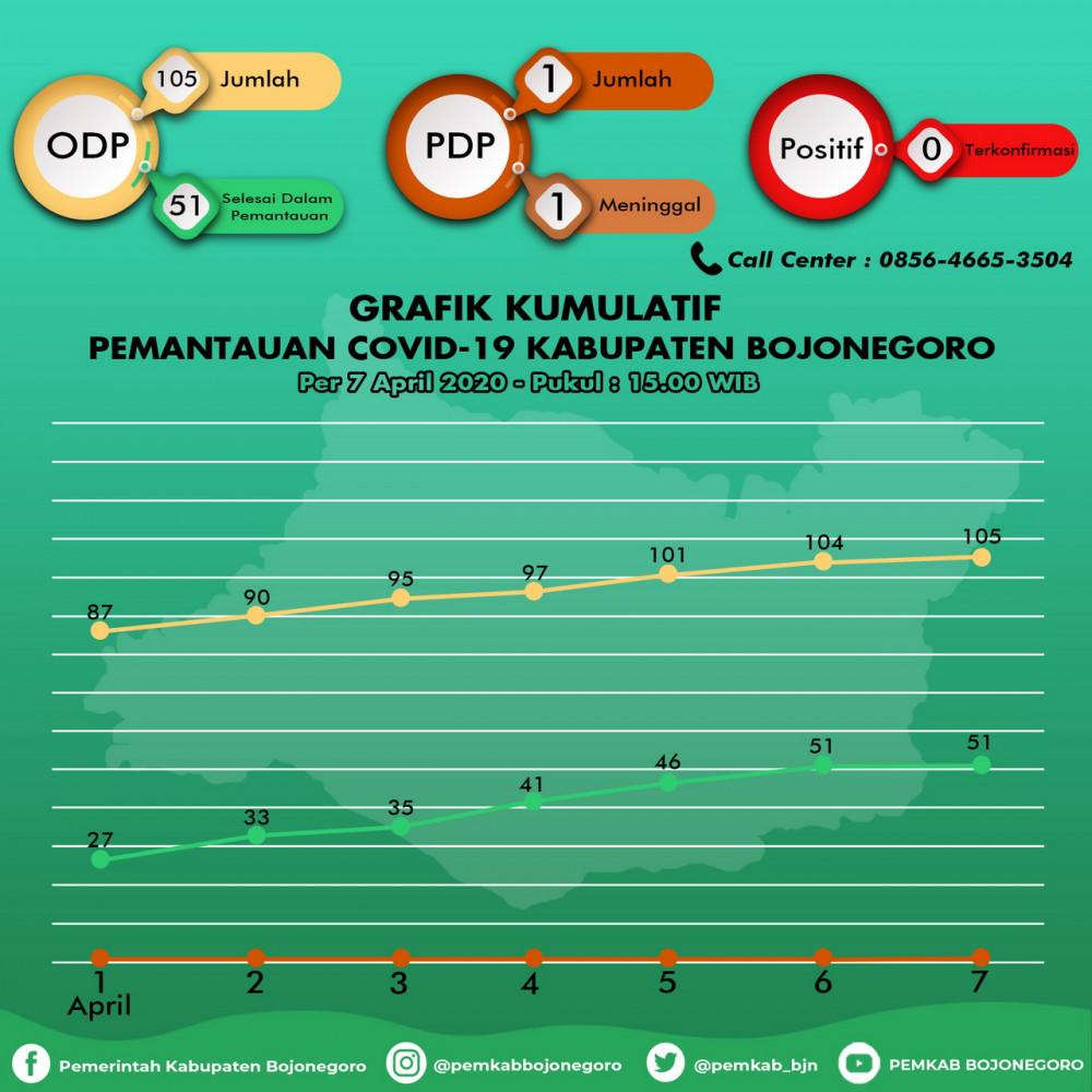 Secara kumulatif, jumlah ODP di Kabupaten Bojonegoro sebanyak 105 orang dan 51 orang dinyatakan selesai dalam pemantauan.