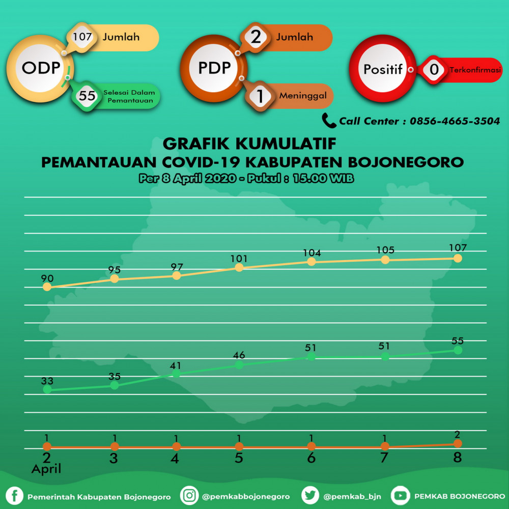 Secara kumulatif, jumlah ODP di Kabupaten Bojonegoro sebanyak 107 orang dan 55 orang dinyatakan selesai dalam pemantauan.