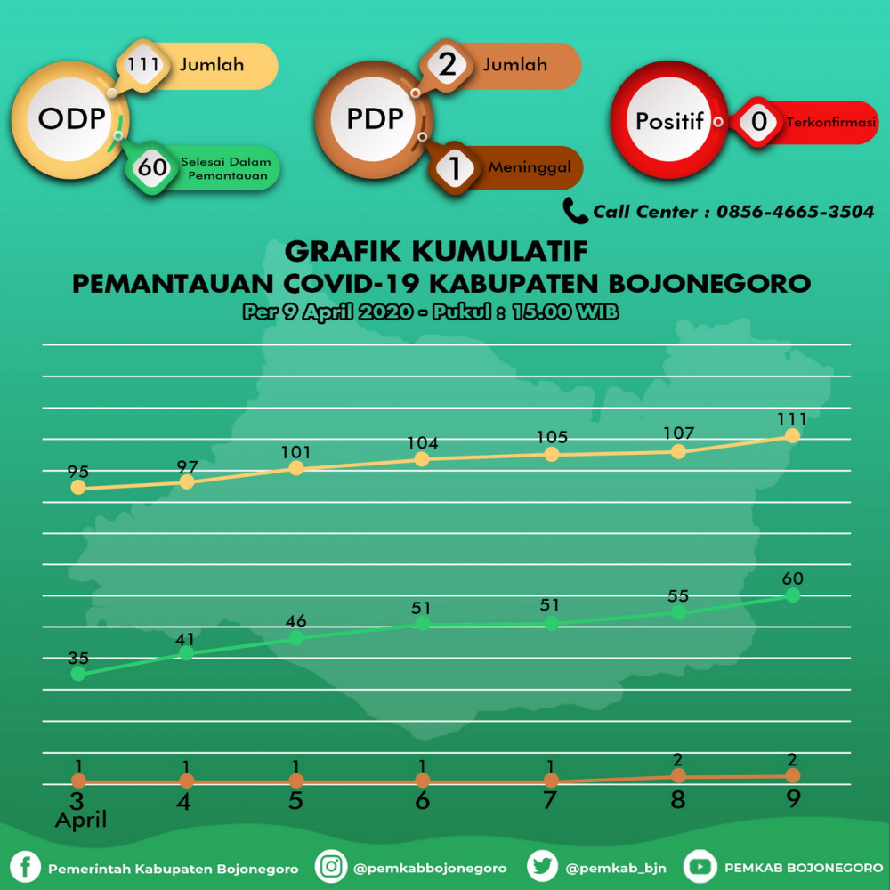 Secara kumulatif, jumlah ODP di Kabupaten Bojonegoro sebanyak 111 orang dan 60 orang dinyatakan selesai dalam pemantauan.