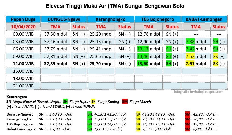 Berikut ini update status TMA Bengawan Solo, yang diterima dari Perum Jasa Tirta I, Divisi Jasa ASA III - Bengawan Solo, untuk tanggal 10 April 2020, hingga pukul 12.00 WIB.