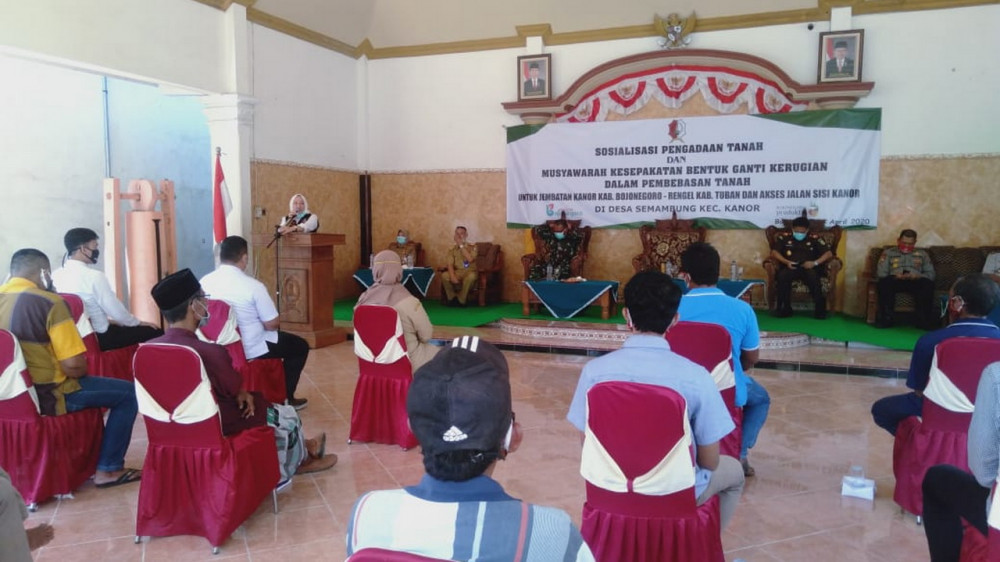 Bojonegoro - Pemerintah Kabupaten (Pemkab) Bojonegoro pada Senin (13/04/2020), melakukan Sosialisasi Pengadaan Tanah dan Musyawarah Kesepakatan Bentuk Ganti Kerugian dalam Pembebasan Tanah untuk Jembatan Kanor - Rengel (Kare), yang menghubungkan Desa Semambung Kecamatan Kanor Kabupaten Bojonegoro dengan Desa Ngadirejo Kecamatan Rengel Kabupaten Tuban.