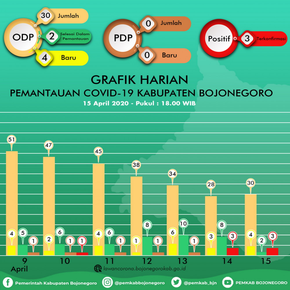 Kepala Bagian (Kabag) Humas dan Protokol Setda Pemkab Bojonegoro, Masirin SSTP MM, menyampaikan bahwa update peta sebaran dan grafik Orang Dalam Pemantauan (ODP) Covid-19 di Kabupaten Bojonegoro per tanggal 15 April 2020, pukul 18.00 WIB, jumlah ODP sebanyak 30 orang.