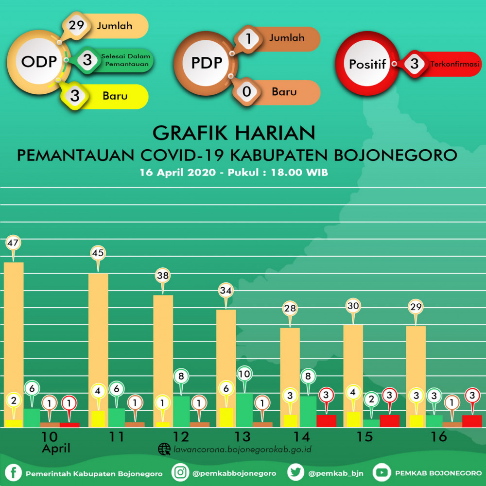 Kepala Bagian (Kabag) Humas dan Protokol Setda Pemkab Bojonegoro, Masirin SSTP MM, menyampaikan bahwa update peta sebaran dan grafik Orang Dalam Pemantauan (ODP) Covid-19 di Kabupaten Bojonegoro per tanggal 15 April 2020, pukul 18.00 WIB, jumlah ODP sebanyak 29 orang.