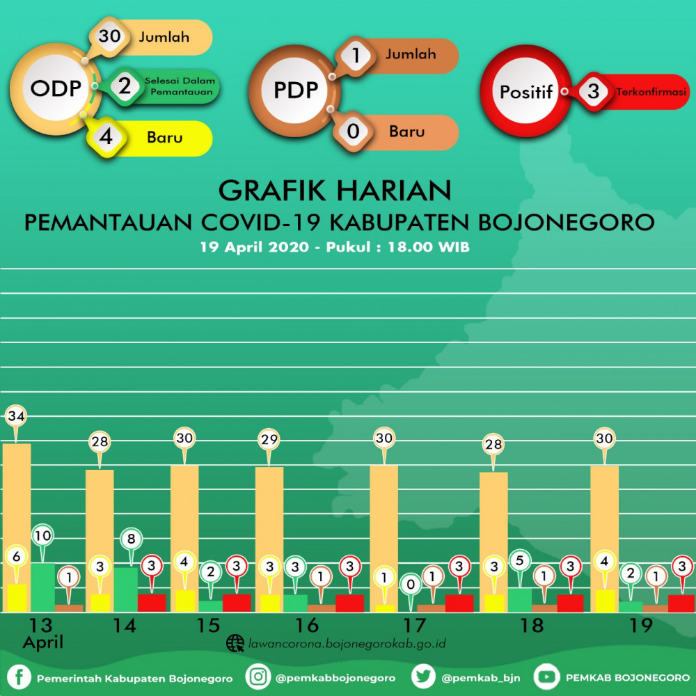 Kepala Bagian (Kabag) Humas dan Protokol Setda Pemkab Bojonegoro, Masirin SSTP MM, menyampaikan bahwa update peta sebaran dan grafik Orang Dalam Pemantauan (ODP) Covid-19 di Kabupaten Bojonegoro per tanggal 19 April 2020, pukul 18.00 WIB, bahwa jumlah ODP sebanyak 30 orang, sementara untuk status PDP sebanyak 1 orang. Sedangkan untuk status terkonfirmasi positif 4 orang, dengan rincian 3 orang dalam perawatan, dan 1 orang telah meninggal dunia.