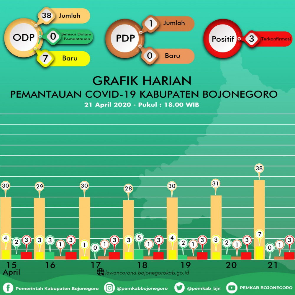 Kepala Bagian (Kabag) Humas dan Protokol Setda Pemkab Bojonegoro, Masirin SSTP MM, menyampaikan bahwa update peta sebaran dan grafik Orang Dalam Pemantauan (ODP) Covid-19 di Kabupaten Bojonegoro per tanggal 21 April 2020, pukul 18.00 WIB, bahwa jumlah ODP sebanyak 38 orang.