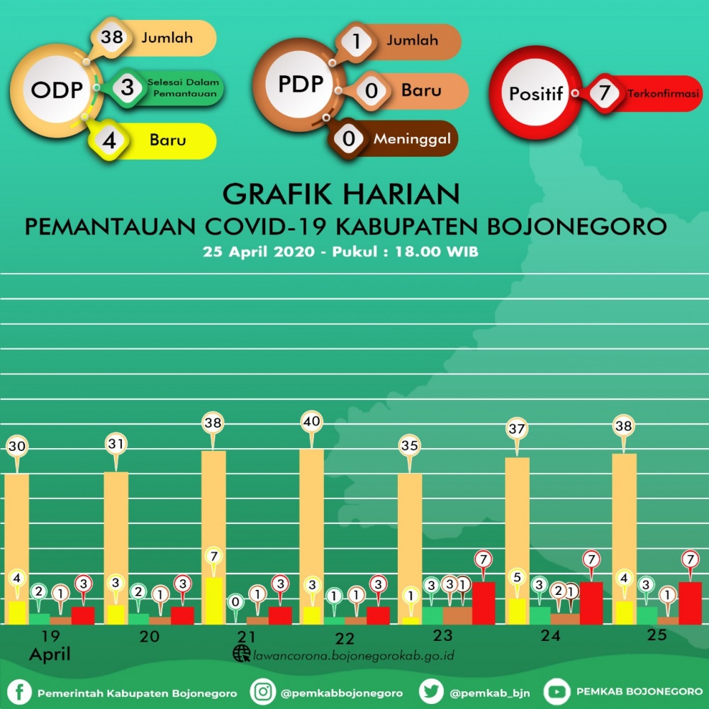 Kepala Bagian (Kabag) Humas dan Protokol Setda Pemkab Bojonegoro, Masirin SSTP MM, menyampaikan bahwa update peta sebaran dan grafik Orang Dalam Pemantauan (ODP) Covid-19 di Kabupaten Bojonegoro per tanggal 24 April 2020, pukul 18.00 WIB, bahwa jumlah ODP sebanyak 38 orang, yang tersebar di 17 kecamatan di Kabupten Bojonegoro.dengan kondisi 23 orang masuk kategori low risk (risiko rendah), 12 orang masuk kategori medium risk (risiko menegah), dan 3 orang yang masuk kategori hight risk (risiko tinggi).