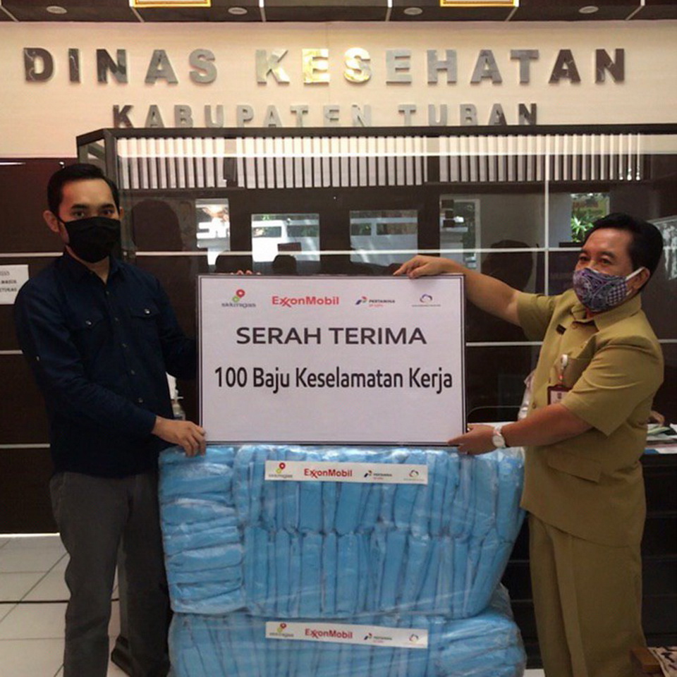Bojonegoro - Operator Lapangan Banyu Urip, ExxonMobil Cepu Limited (EMCL) didukung penuh oleh SKK Migas, pada Senin (27/04/2020) serah terimakan baju keselamatan kerja dan rapid test kit kepada Dinas Kesehatan Tuban dan Bojonegoro.