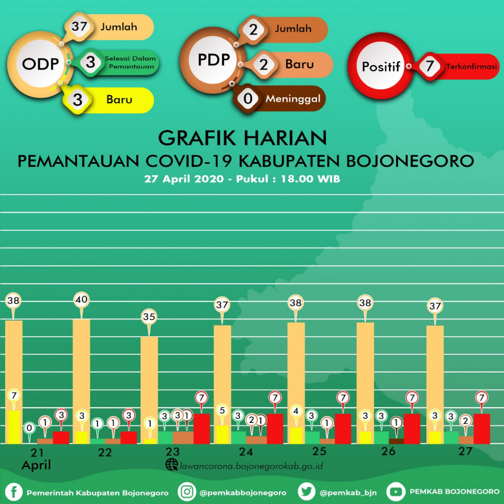 Kepala Bagian (Kabag) Humas dan Protokol Setda Pemkab Bojonegoro, Masirin SSTP MM, menyampaikan bahwa update peta sebaran dan grafik Orang Dalam Pemantauan (ODP) Covid-19 di Kabupaten Bojonegoro per tanggal 27 April 2020, pukul 18.00 WIB, bahwa jumlah ODP sebanyak 37 orang, yang tersebar di 16 kecamatan di Kabupten Bojonegoro.dengan kondisi 24 orang masuk kategori low risk (risiko rendah), 11 orang masuk kategori medium risk (risiko menegah), dan 2 orang yang masuk kategori hight risk (risiko tinggi).