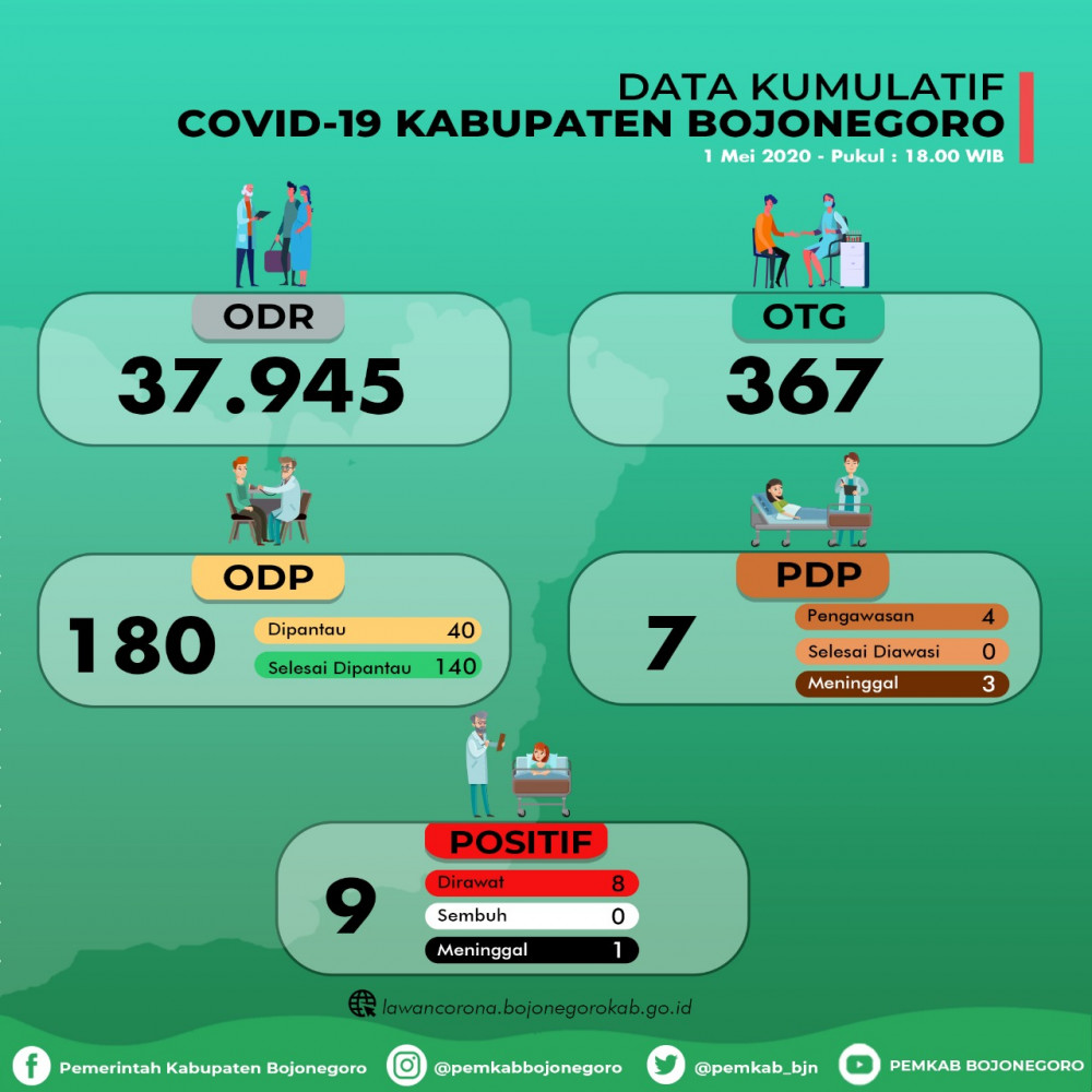 Bojonegoro - Pemerintah Kabupaten (Pemkab) Bojonegoro, melalui Juru Bicara Gugus Tugas Penanggulangan Bencana Non Alam dan Percepatan Penanganan Covid-19 Kabupaten Bojonegoro, Masirin SSTP MM, pada Jumat (01/05/2020) malam menyebutkan bahwa di Kabupaten Bojonegoro ada 1 orang lagi yang terkonfirmasi positif virus Corona (Covid-19).