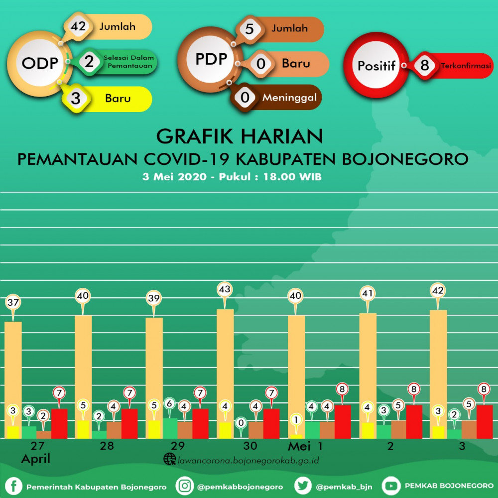 Bojonegoro - Data terbaru yang dirilis Pemerintah Kabupaten (Pemkab) Bojonegoro menyebutkan bahwa jumlah orang dalam pemantauan (ODP) virus Corona (Covid-19) di Kabupaten Bojonegoro hingga Minggu (03/05/2020) bertambah sebanyak 1 orang, dari hari sebelumnya sebanyak 41 orang, kini menjadi 42 orang, yang tersebar di 16 kecamatan di Kabupten Bojonegoro.