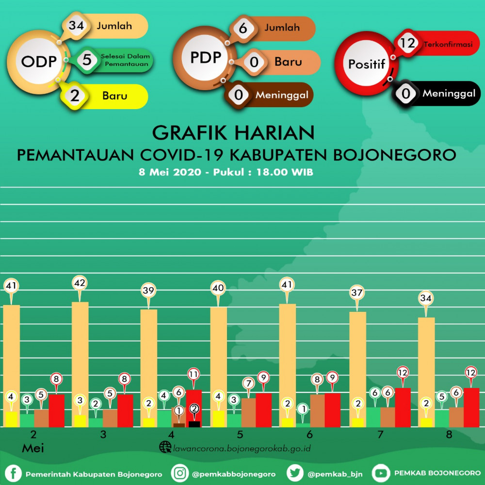 Untuk status positif terkonfirmasi pada hari ini tetap yaitu sebanyak 12 orang di Kecamatan Bojonegoro 3 orang, Trucuk 2 orang, Sumberejo 1 orang, Kepohbaru 1 orang, Gondang 3 orang, Purwosari 1 orang dan Ngraho 1 orang.