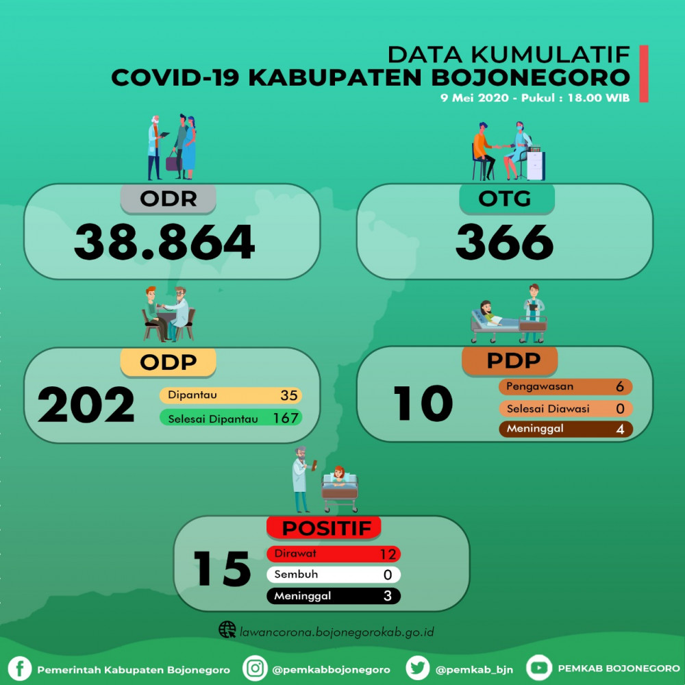 Sementara, update terbaru perkembangan pemantauan persebaran virus Corona (Covid-19) di Kabupaten Bojonegoro, hingga hari Sabtu (09/05/2020), untuk jumlah orang dalam pemantauan (ODP) bertambah 1 orang jika dibanding dengan hari sebelumnya yaitu sebanyak 34 orang, dan kini menjadi sebanyak 35 orang.