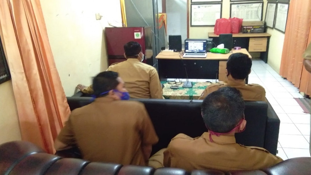 Camat Temayang bersama sejumlah Kepala Desa, saat ikuti sosialisasi penyaluran Dana Desa (DD) melalui video conference (vidcon), di Kantor Kecamatan Temayang. Senin (11/05/2020)