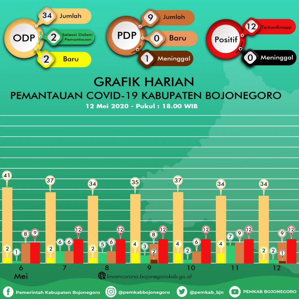 Juru Bicara Gugus Tugas Penanggulangan dan Percepatan Penanganan Virus Corona (Covid-19) Kabupaten Bojonegoro, Masirin SSTP MM, menyampaikan bahwa update peta sebaran Covid-19 di Kabupaten Bojonegoro per Selasa (12/05/2020), pukul 18.00 WIB, menuturkan bahwa untuk status ODP, hari ini masih ada penambahan baru sebanyak 2 orang, dari Kecamatan Malo 1 orang dan Kecamatan Tambakrejo 1 orang. Untuk ODP yang selesai dalam pemantauan sebanyak 2 orang dari Kecamatan Gayam 1 orang dan Kecamatan Sumberejo 1 orang.