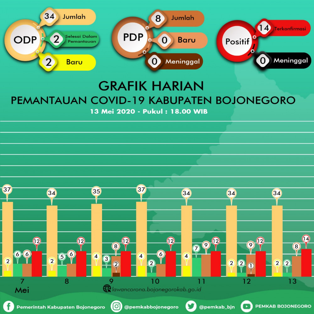 Bojonegoro - Pemerintah Kabupaten (Pemkab) Bojonegoro, melalui Juru Bicara Gugus Tugas Penanggulangan dan Percepatan Penanganan Virus Corona (Covid-19) Kabupaten Bojonegoro, kembali menyampaikan update terbaru perkembangan pemantauan persebaran virus Corona (Covid-19) di Kabupaten Bojonegoro, per hari Rabu (13/05/2020).