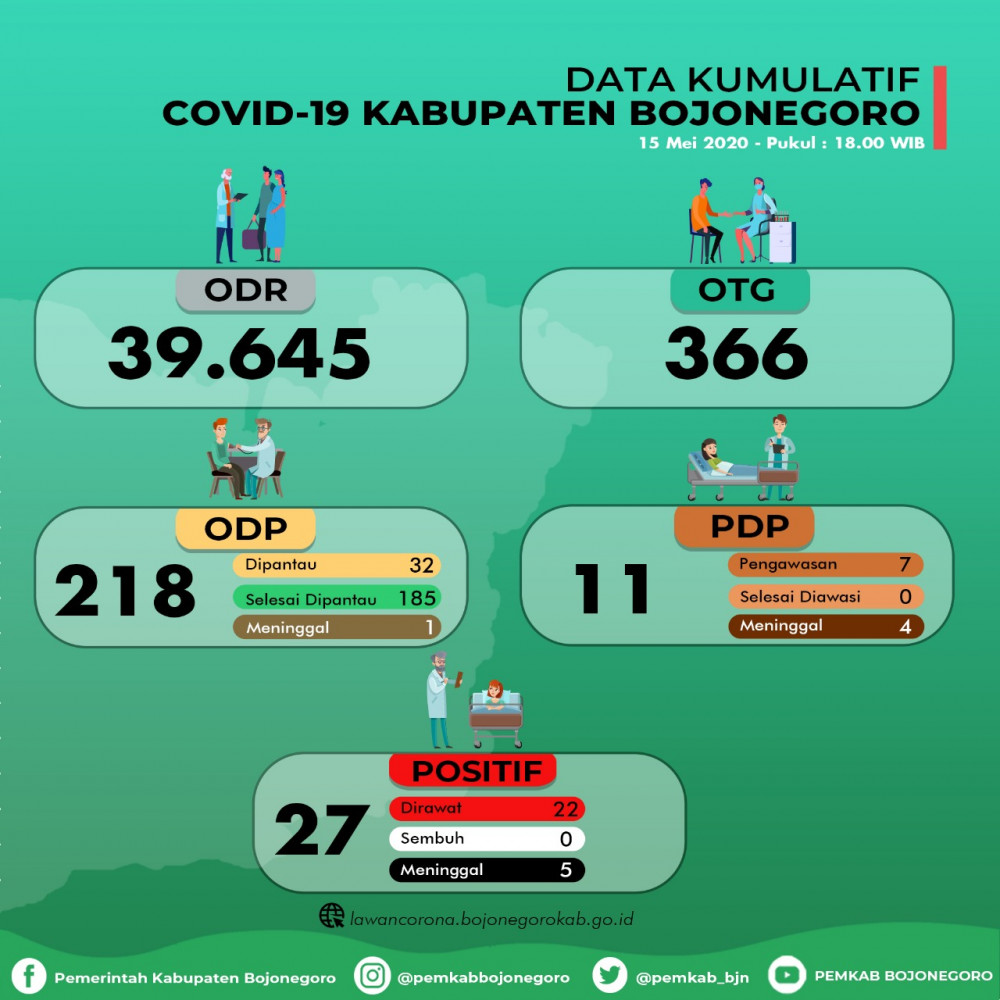 Bojonegoro - Pemerintah Kabupaten (Pemkab) Bojonegoro, melalui Juru Bicara Gugus Tugas Penanggulangan dan Percepatan Penanganan Virus Corona (Covid-19) Kabupaten Bojonegoro, Masirin SSTP MM, pada Jumat (15/05/2020) malam, kembali menyampaikan update terbaru perkembangan pemantauan persebaran virus Corona (Covid-19) di Kabupaten Bojonegoro.