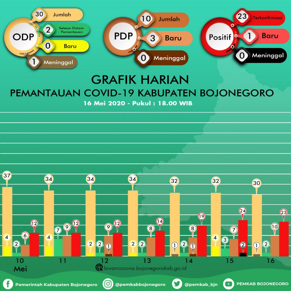 Bojonegoro - Pemerintah Kabupaten (Pemkab) Bojonegoro, melalui Juru Bicara Gugus Tugas Penanggulangan dan Percepatan Penanganan Virus Corona (Covid-19) Kabupaten Bojonegoro, kembali menyampaikan update terbaru perkembangan pemantauan persebaran virus Corona (Covid-19) di Kabupaten Bojonegoro, per hari Sabtu (16/05/2020).