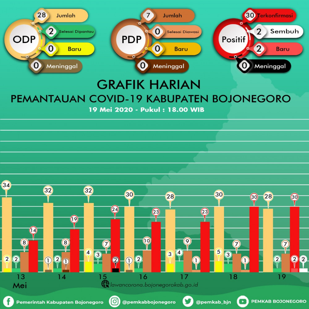 Namun ada kabar gembira, bahwa untuk status positif terkonfirmasi hari ini ada yang dinyatakan sembuh sebanyak 2 orang, setelah hasil swab test hsilnya negatif, yaitu dari Kecamatan Gondang sebanyak 1 orang dan Kecamatan Bojonegoro Kota sebanyak 1 orang.