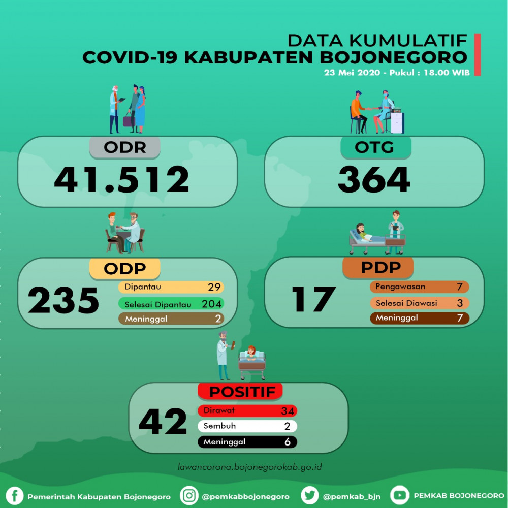 Untuk diketahui, update terbaru perkembangan pemantauan persebaran virus Corona (Covid-19) di Kabupaten Bojonegoro, pada Sabtu (23/05/2020) untuk status Orang Dalam Pemantauan (ODP) keseluruhan secara kumulatif sebanyak 235 orang, meliputi dipantau 29 orang, selesai pemantauan 204 orang dan meninggal dunia 2 orang. Untuk status Orang Dalam Risiko (ODR) sebanyak 41.512 orang dan Orang Tanpa Gejala (OTG) sebanyak 364 orang." kata Masirin.