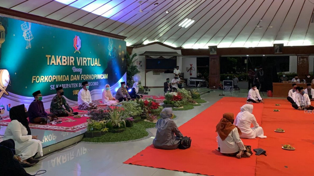 Dalam Takbir Virtual tersebut Bupati bersama jajaran Forkopimda mengambil tempat di Pendapa Malowopati Pemkab Bojonegoro, sementara jajaran Forkopimcam se Kabupaten Bojonegoro, mengambil tempat di Pendapa Kecamatan masing-masing, yang terkoneksi mengunakan aplikasi Zoom.