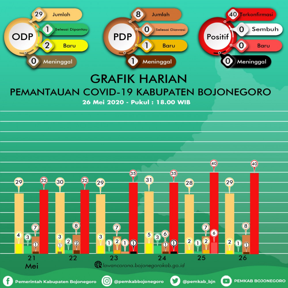 Sementara itu, untuk status Orang Dalam Pemantauan (ODP), hari ini ada penambahan baru sebanyak 2 orang dari Kecamatan Trucuk sebanyak 1 orang dan Kecamatan Dander sebanyak 1 orang. Sedangkan yang selesai dalam pemantauan sebanyak 1 orang dari Kecamatan Ngasem, sehingga jumlah ODP pada hari ini adalah sebanyak 29 orang.