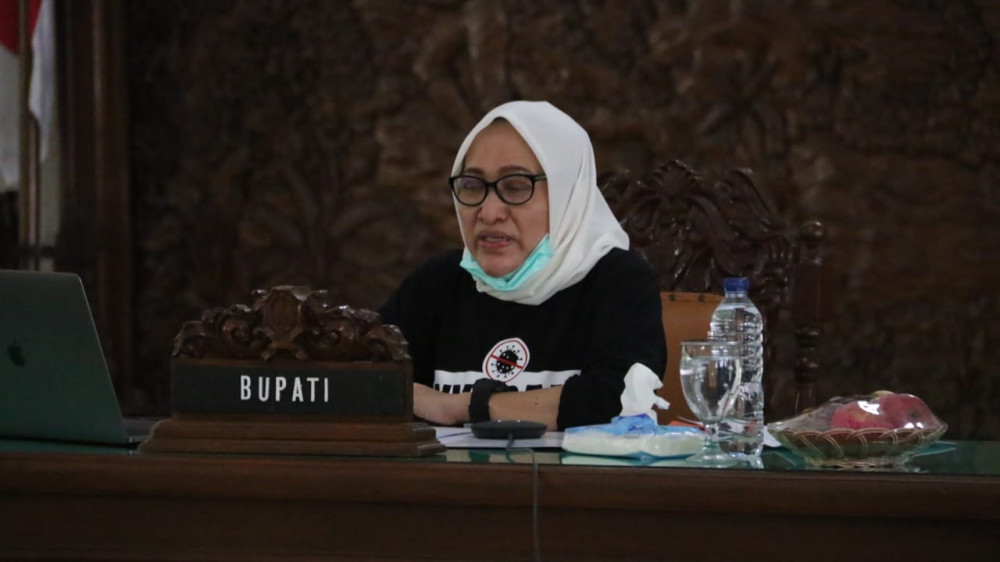 Bupati Bojonegoro, Dr Hj Anna Muawanah, saat gelar seminar ngobrol bareng milenial melalui video conference (vidcon) yang membahas program beasiswa di Pendapa Malowopati Pemkab Bojonegoro, Rabu (27/05/2020)