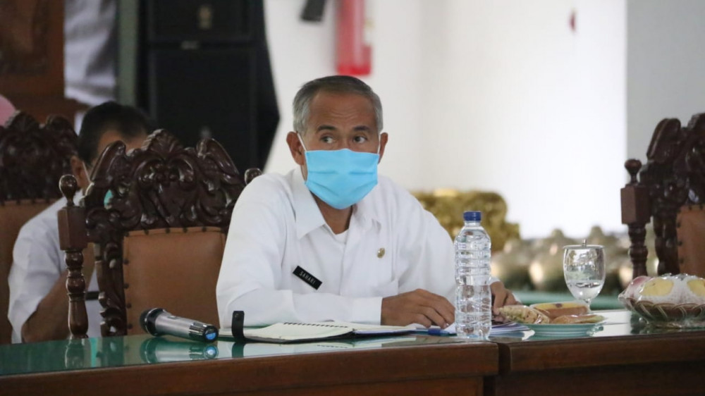 Kepala Bagian Kesra Setda Kabupaten Bojonegoro, Drs Sahari MM, saat ikuti seminar ngobrol bareng milenial melalui video conference (vidcon) di Pendapa Malowopati Pemkab Bojonegoro, Rabu (27/05/2020)
