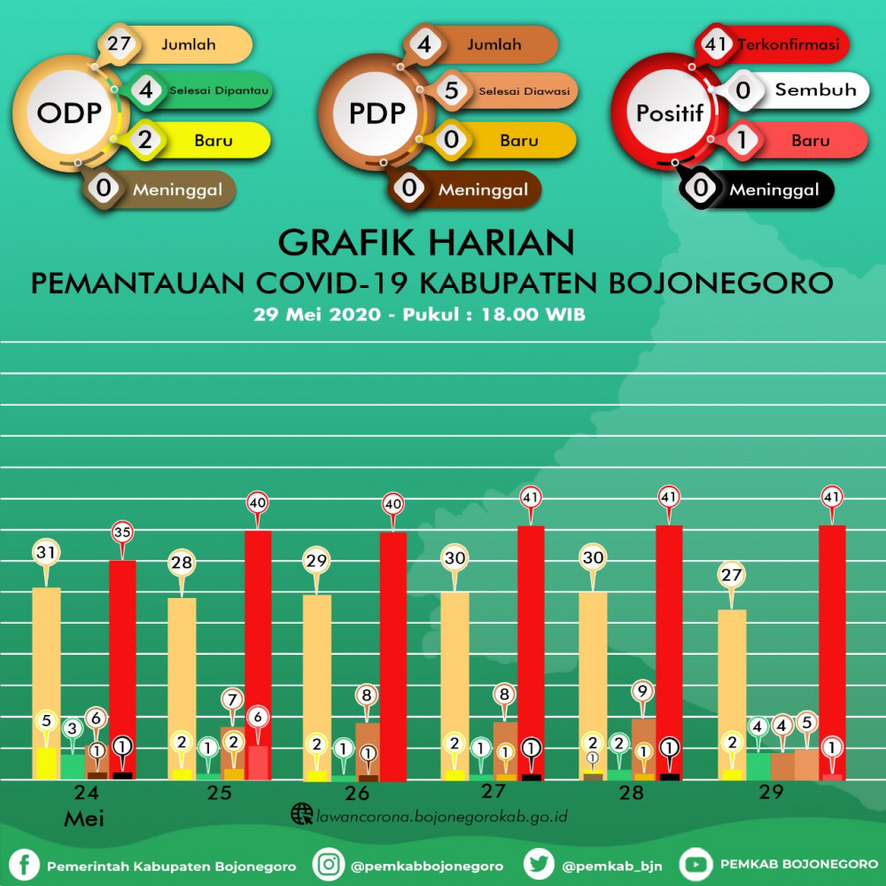 Untuk status positif terkonfirmasi hari ini masih terdapat penambahan baru sebanyak 1 orang dari Kecamatan Bojonegoro Kota, sehingga jumlah positif terkonfirmasi hari ini sebanyak 41 orang.