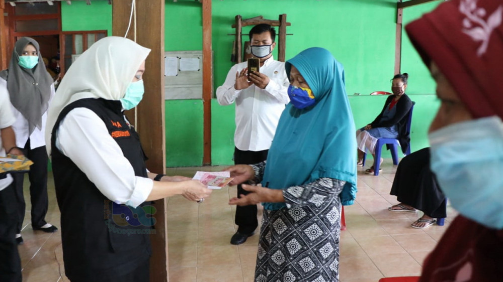 Bupati Bojonegoro, Dr Hj Anna Muawanah saat secara simbolis serahkan BLT Dana Desa kepada warga terdampak virus Corona (Covid-19) di Desa Geneng Kecamatan Margomulyo Bojonegoro. Rabu (03/06/2020)