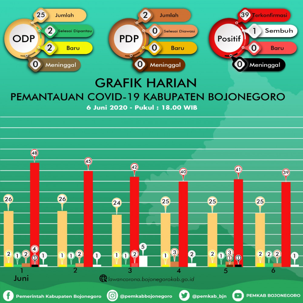 Update Corona Bojonegoro 6 Juni: ODP 25, PDP 2, Positif 63 Meninggal 11 Sembuh 13