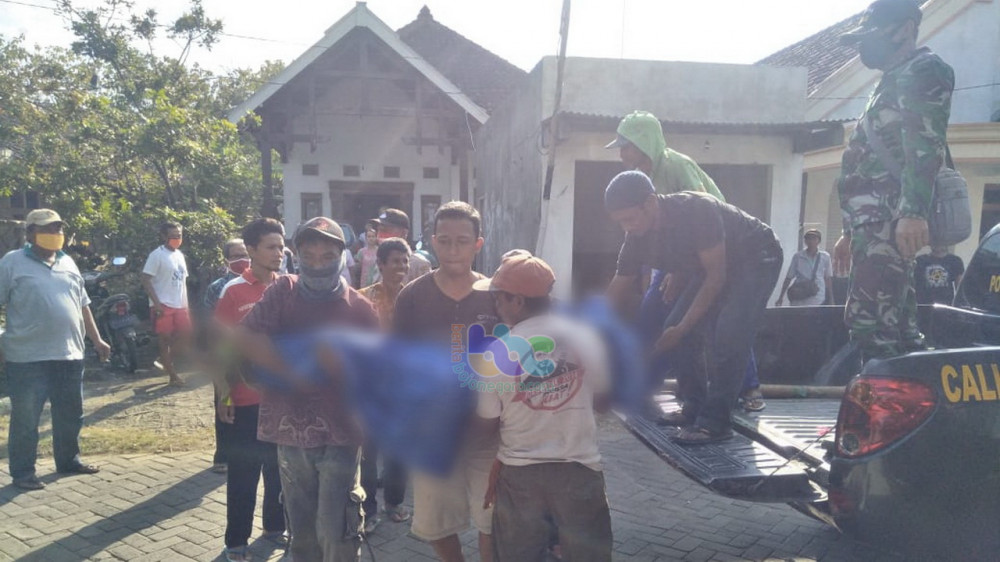 Petugas bersama warga, saat mengevakuasi jenazah Widjanarko alias Pak Raden (60) warga Desa Sumberarum Kecamatan Dander Bojonegoro, yang ditemukan meninggal Sabtu (13/06/2020)