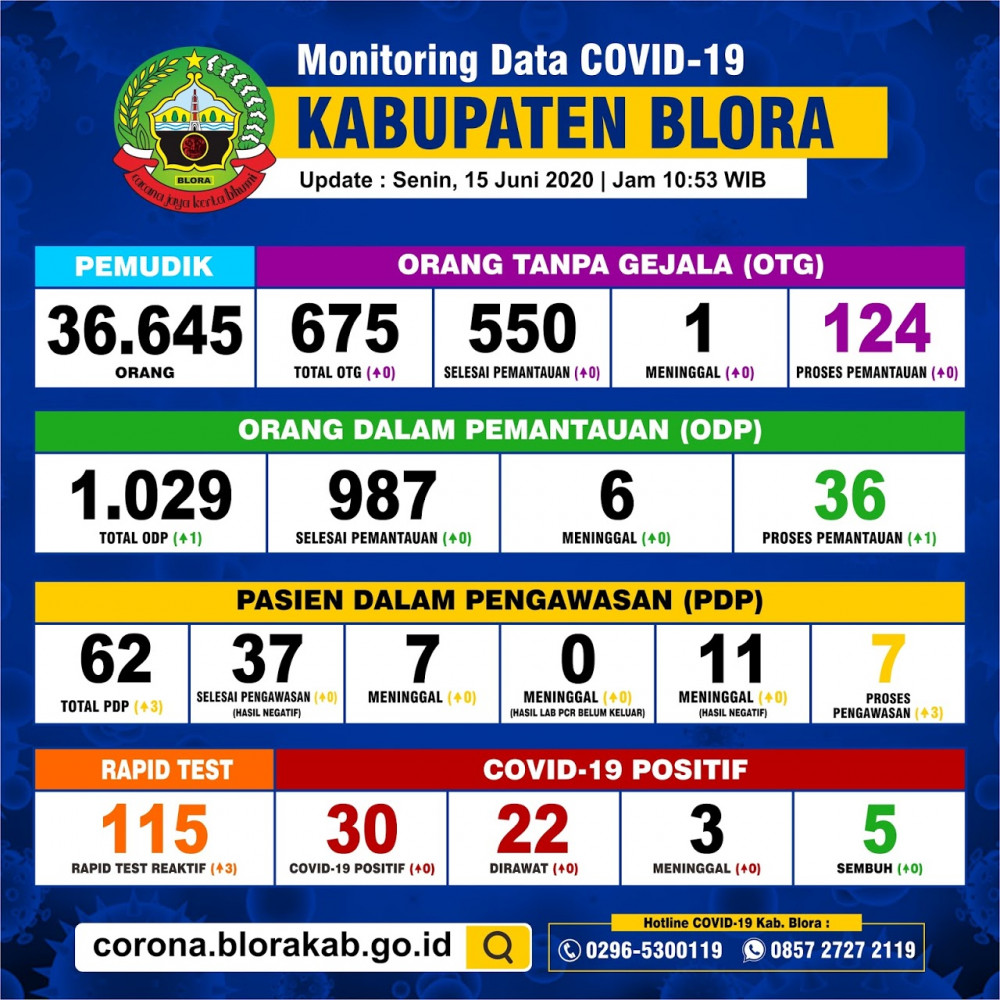 Infografis data perkembangan pemantauan Virus Corona (Covid-19) di Kabupaten Blora hingga Senin (15/06/2020)
