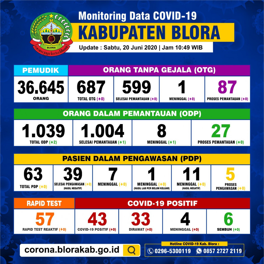 Infografis data perkembangan Virus Corona (Covid-19) di Kabupaten Blora hingga Sabtu (20/06/2020)