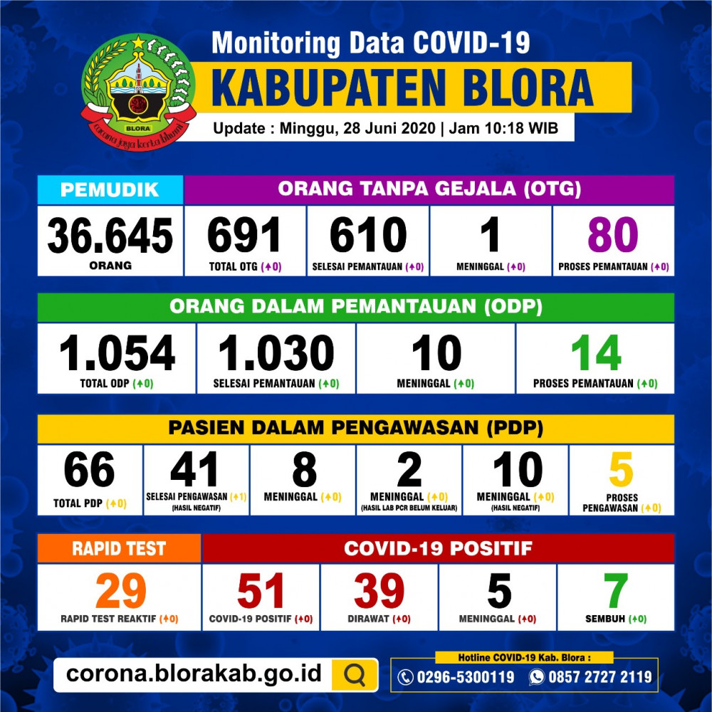 Infografis data perkembangan Virus Corona (Covid-19) di Kabupaten Blora hingga Minggu (28/06/2020)