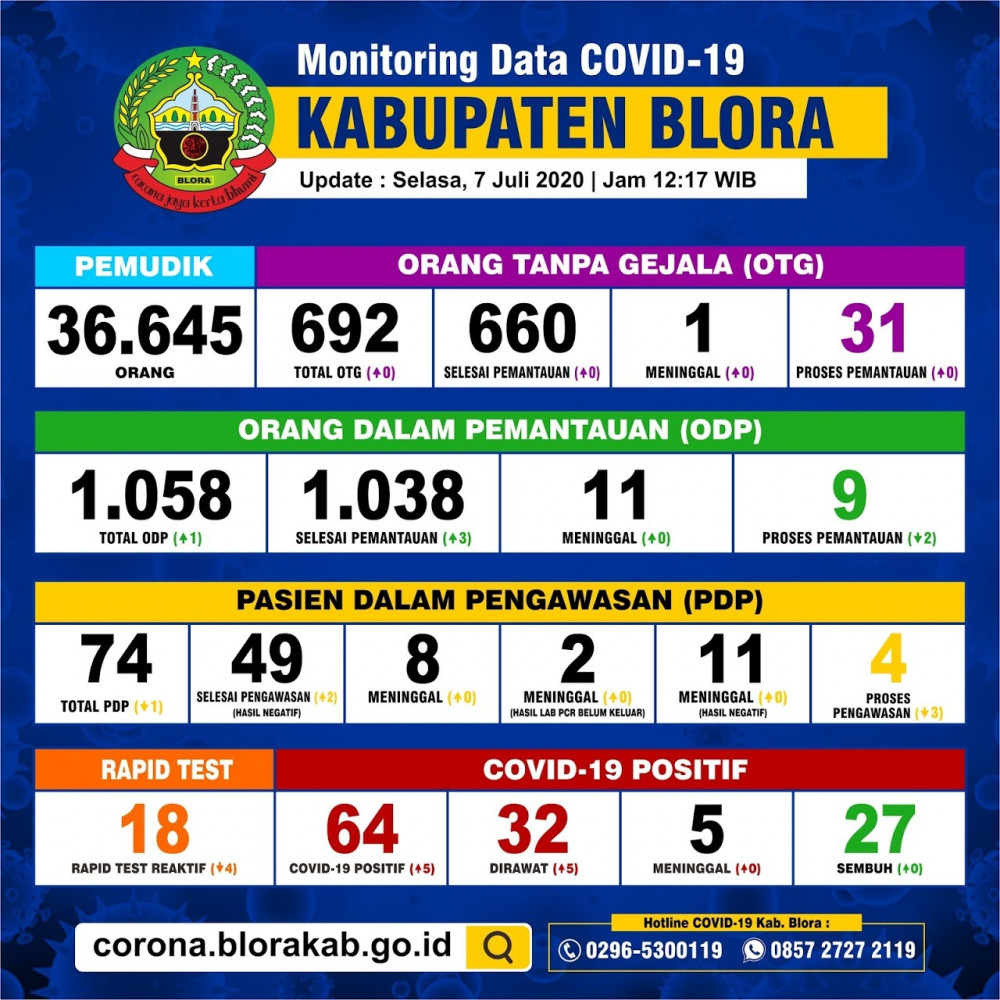 "Jumlah positif terkonfirmasi kumulatif di Kabupaten Blora ada 64 kasus. Dengan rincian 32 dirawat, 27 sembuh, dan 5 meninggal." tutur Lilik Hernanto SKM MKes.