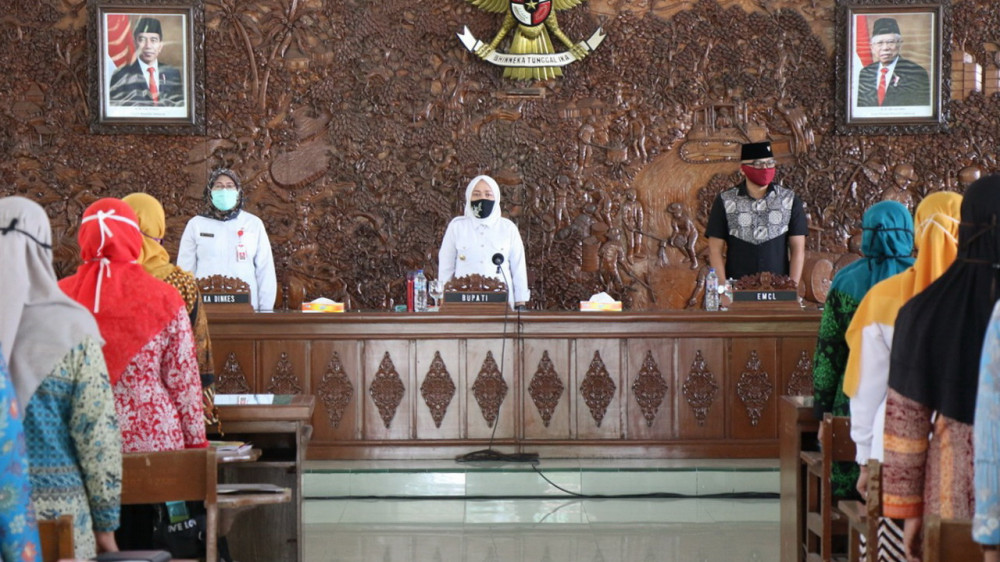 Bupati Bojonegoro Dr Hj Anna Muawanah, saat hadiri Pertemuan Pembekalan dan Pembinaan Kader Pendamping Ibu Hamil Risiko Tinggi di Pendapa Malowopati Pemkab Bojonegoro, Rabu (08/07/2020)