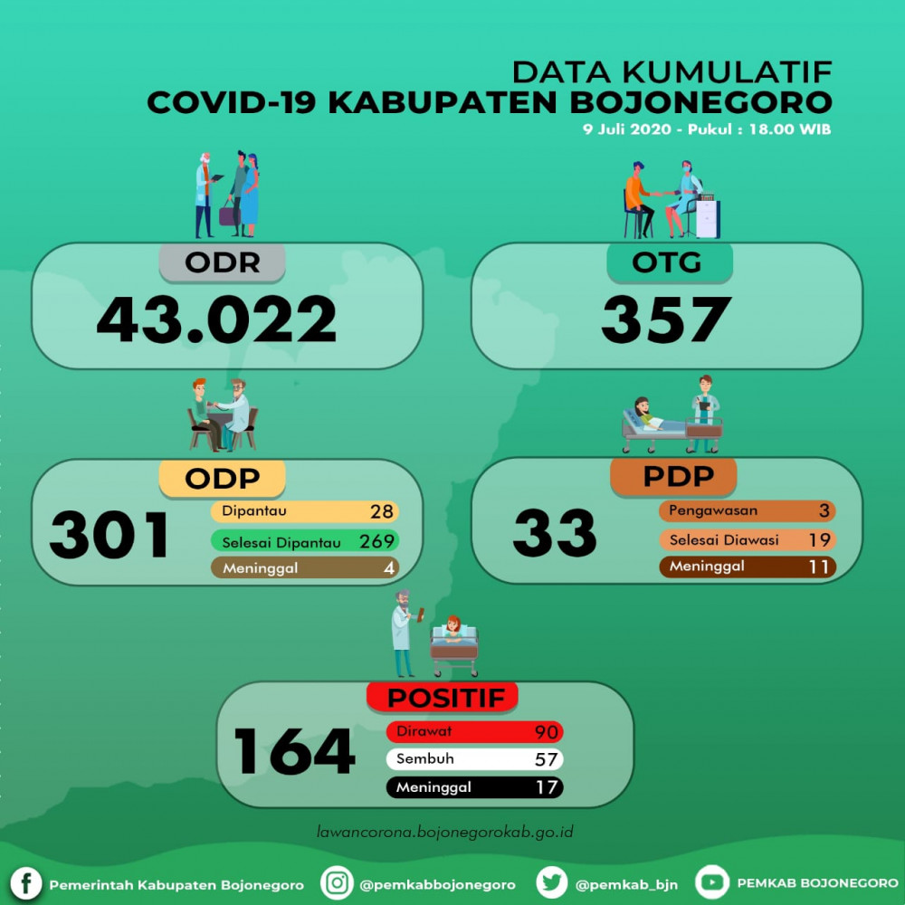 Untuk diketahui, update perkembangan pemantauan virus Corona (Covid-19) di Kabupaten Bojonegoro hingga Rabu (08/07/2020) malam, untuk status Orang Dalam Risiko (ODR) sebanyak 43.014 orang dan Orang Tanpa Gejala (OTG) sebanyak 357 orang.
