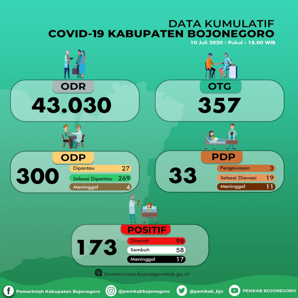 Diberitakan sebelumnya, update perkembangan pemantauan virus Corona (Covid-19) di Kabupaten Bojonegoro, hingga Kamis (09/07/2020), untuk status Orang Dalam Risiko (ODR) sebanyak 43.022 orang dan Orang Tanpa Gejala (OTG) sebanyak 357 orang.