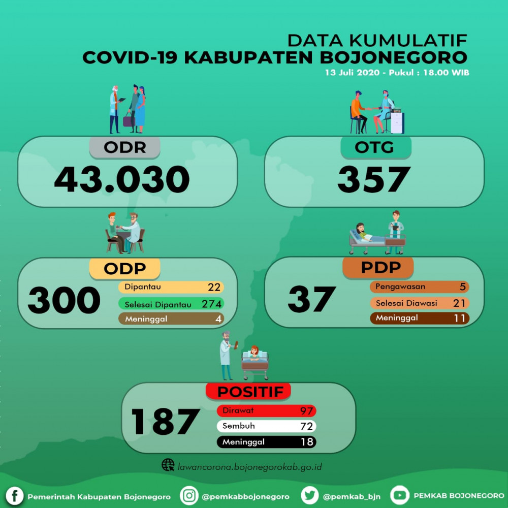 "Jumlah positif terkonfirmasi kumulatif hari ini sebanyak 187 orang, meliputi yang dirawat 97 orang, sembuh 72 orang dan meninggal dunia 18 orang." kata Masirin.